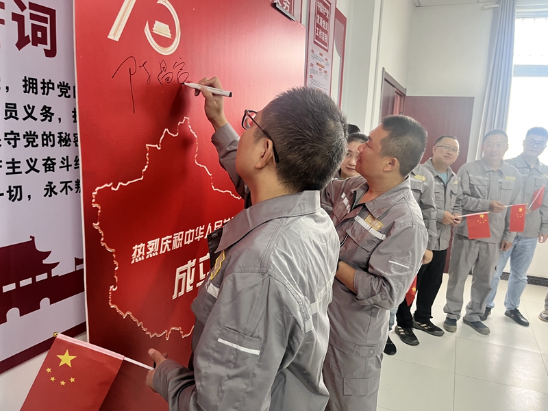 在公司黨員活動室內,公司總經理陳昌富帶領全體職工合唱歌曲“歌唱祖國”,全體人員懷著對黨、對祖國的滿腔熱忱在簽到墻上鄭重的簽上自己的名字;公司職工在馬塘湖礦各裝車點、磅房等多處插上了鮮艷的五星紅旗。雄壯嘹亮的歌聲是對祖國未來的無限憧憬,整齊有力的簽名是對祖國深深的祝福和崇高的敬意,飄揚的五星紅旗表達了對偉大祖國真摯的自豪和驕傲。